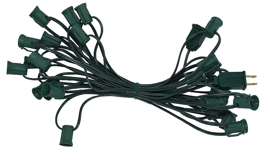Use our C7 25-foot green wire light strings for incandescent and retrofit LED bulbs as well as G30/G40 globes when lighting up your home or business this Christmas. Each string has 25 E12 Candelabra sockets with 12-inch spacing. Three strings can be connected end-to-end when using 5 watt bulbs. Safe for indoor and outdoor use.