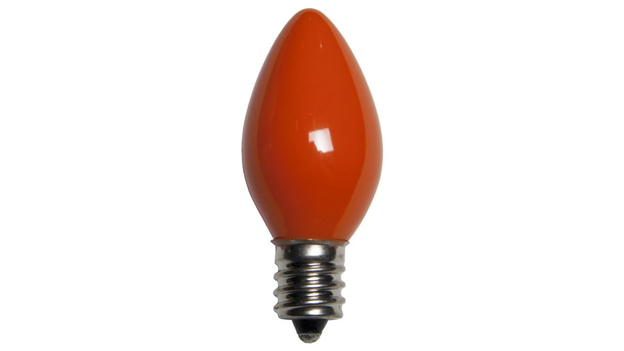 Our scratch resistant steady burn C7 opaque orange replacement bulbs have an E12 candelabra nickle base and an average life of 3,000 hours. These 5 watt incandescent bulbs can be safely used for all types of indoor or outdoor Christmas decorating or any special event lighting project. There are 25 bulbs per box or poly bag.