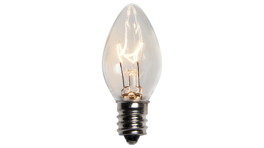 Our steady burn C7 transparent clear replacement bulbs have an E12 candelabra nickle base and an average life of 3,000 hours. These clear incandescent bulbs are rated at 5 watts and can be safely used indoors or outdoors for all types of Christmas decorating or special event lighting projects. They’re also a cost effective alternative to LED warm white bulbs. There are 25 bulbs per poly bag.