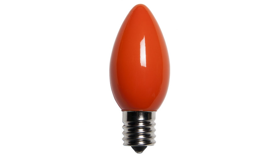 Our C9 opaque orange replacement bulbs have an E17 intermediate nickle base and they can be safely used for indoor or outdoor Christmas decorating or any special event lighting project. These 7 watt incandescent bulbs have an average life of 3,000 hours and they’re scratch resistant to make them last for many years. There are 25 bulbs per box or poly bag.