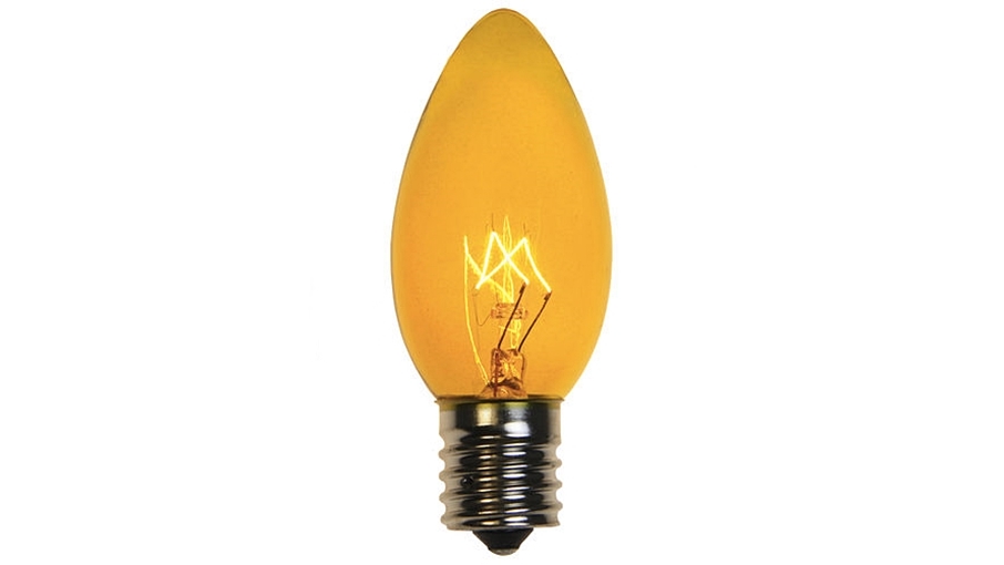 Our peel resistant steady burn double dipped C9 transparent Yellow replacement bulbs have an E17 intermediate nickle base and an average life of 3,000 hours. These incandescent bulbs are rated at 7 watts and can be safely used for all types of indoor or outdoor Christmas decorating or any special event lighting project. There are 25 bulbs per box or poly bag.