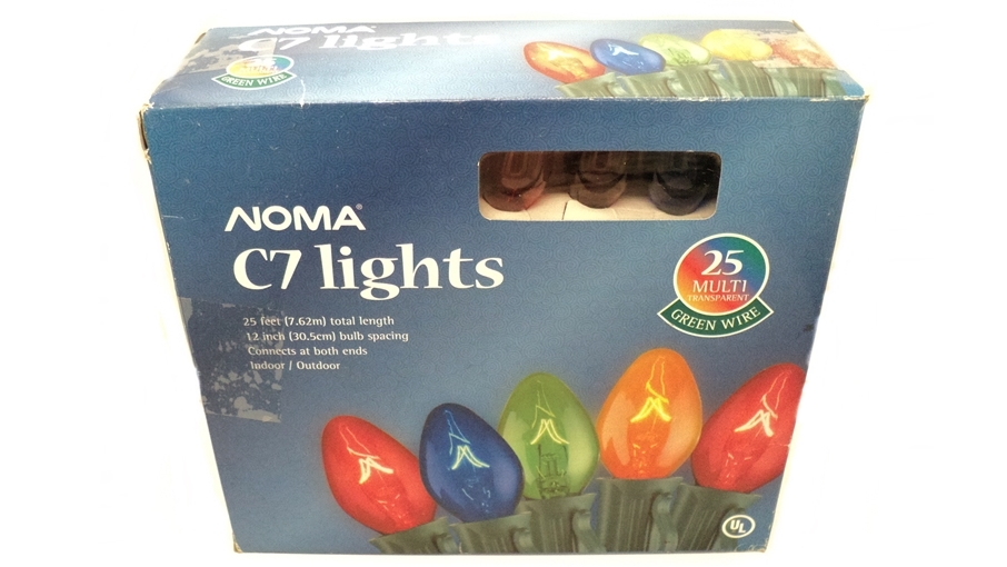 Our Noma C7 transparent multi color Christmas lights are double dipped to give them a warm glow and they can be hung literally anywhere. This 25-light set is UL Listed and can be safely used for indoor and outdoor decorating. The C7 bulbs used for this string have a nickel plated candelabra base with an energy consumption of 5 watts and 130 volts. The bulbs have an expected life of 3,000 hours and the stringers will last indefinitely depending on use.